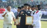 Gubernur Jawa Barat Ridwan Kamil memberikan penghargaan-penghargaan saat Apel Besar Paskibraka Se-Jawa Barat Tahun 2023 di halaman belakang, Gedung Sate, Kota Bandung, Ahad (20/8/2023). Apel Besar bertajuk Paskibraka Sebagai Pengawal Pancasila untuk Indonesia Juara lahir dan Batin ini merupakan acara rutin untuk mempererat silaturahim para Paskibraka seluruh angkatan se-Jawa Barat. Apel Besar Paskibraka dihadiri sekitar 5.000 anggota Paskibraka dari 27 kabupaten/kota di Jawa Barat. (FOTO : Edi Yusuf/Republika)