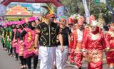 REPUBLIKA.CO.ID, BEKASI -- Peserta menampilkan atraksi budaya dari Jawa Barat dalam karnaval Pesona Nusantara Bekasi Keren 2023 di kawasan jalan Ahmad Yani, Kota Bekasi, Jawa Barat, Ahad (20/8/2023).