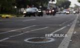 Tanda olah TKP kecelakaan antara truk dan motor yang melawan arah di Jalan Raya Lenteng Agung, Jakarta Selatan, Selasa (22/8/2023). Pasca kecelakaan lalu lintas antara truk dan tujuh pengendara motor yang melawan arah pelanggaran lalu lintas masih kerap dilakukan di jalan tersebut. Pengendara motor lebih memilih melawan arah untuk mempersingkat jarak tempuh menuju tempat tujuan meskipun dapat membahayakan keselamatannya maupun pengendara lain. (FOTO : Republika/Putra M. Akbar)
