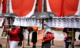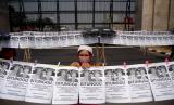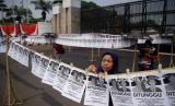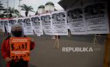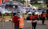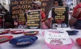 Sejumlah aktivis Pekerja Rumah Tangga (PRT) menggelar akis mogok makan di depan Gedung DPR/MPR RI, Jakarta, Senin (14/8/2023). Aksi itu dilakukan agar DPR dan Pemerintah membahas dan mengesahkan Rancangan Undang- Undang tentang Perlindungan Pekerja Rumah Tangga. (RUU PPRT). Sekitar 30 orang turut mengikuti aksi tersebut dengan menawa poster bertuliskan tuntutannya. Selain itu terdapat sejumlah piring berisikan barang-barang yang menyimbolkan pekerjaan rumah tangga. (FOTO : Republika/Prayogi)