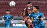 Pesepak bola PSM Makassar Safrudin Tahar (kiri) berebut bola dengan pesepak bola Yangon United Yan Kyaw Htwe (kanan) dalam babak playoff AFC Cup 2023 di Stadion Kapten I Wayan Dipta, Gianyar, Bali, Rabu (23/8/2023). (FOTO : ANTARA FOTO/Fikri Yusuf)