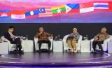 Deputi Komisioner Edukasi dan Perlindungan Konsumen OJK, Sarjito (kedua kiri) bersama Gubernur Provinsi Quirino Filipina Dakila Carlo E. Cua, Direktur Eksekutif Pengembangan UMKM dan Perlindungan Konsumen Bank Indonesia, Yunita Resmi Sari dan Wali Kota ke-13 Kuala Lumpur Malaysia, Datuk Seri Mahadi Che Ngah (kiri-kanan) saat menjadi panelis dalam acara OJK Seminar On Financial Inclusion di Jakarta Convention Center, Jakarta, Kamis (24/8/2023). Otoritas Jasa Keuangan (OJK) menggelar kegiatan seminar dengan tema Closing The Financial Inclusion on Financial Inclusion and Urbans Through Digital Financial Inclusion yang dihadiri sejumlah tokoh dari perwakilan negara ASEAN. Seminar tersebut merupakan rangkaian dari kegiatan ASEAN Chairmanship 2023 yang akan berlangsung pada 5-7 September 2023 mendatang. (FOTO : Republika/Thoudy Badai)