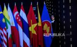 Petugas mempersiapkan acara OJK Seminar On Financial Inclusion di Jakarta Convention Center, Jakarta, Kamis (24/8/2023). Otoritas Jasa Keuangan (OJK) menggelar kegiatan seminar dengan tema Closing The Financial Inclusion on Financial Inclusion and Urbans Through Digital Financial Inclusion yang dihadiri sejumlah tokoh dari perwakilan negara ASEAN. Seminar tersebut merupakan rangkaian dari kegiatan dari ASEAN Chairmanship 2023 yang akan berlangsung pada 5-7 September 2023 mendatang. (FOTO : Republika/Thoudy Badai)
