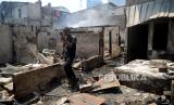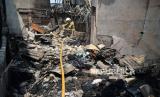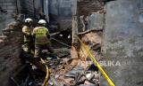 Petugas pemadam kebakaran melakukan pemadaman sisa api lokasi kebakaran di kawasan Petojo Selatan, Gambir, Jakarta, Kamis (24/8/2023). Kebakaran yang melahap rumah padat penduduk itu terjadi pada Rabu (23/8/2023) malam yang diduga berasal dari ledakan kompor gas. Adapun, jumlah warga terdampak mencapai 574 orang yang terdiri dari dari 196 KK dan 152 rumah warga hangus terbakar akibat peristiwa tersebut. (FOTO : Republika/Prayogi.)