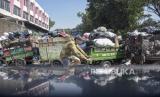 Deretan gerobak sampah di TPS Pasar Ancol, Pungkur, Kota Bandung, Jawa Barat, Kamis (24/8/2023). Penumpukan sampah tersebut imbas dari penutupan sementara TPA Sarimukti akibat kebakaran yang hingga saat ini belum berhasil dipadamkan. (FOTO : ABDAN SYAKURA/REPUBLIKA)