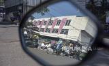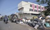 Pengendara melintas di samping tumpukan sampah di TPS Pasar Ancol, Pungkur, Kota Bandung, Jawa Barat, Kamis (24/8/2023). Penumpukan sampah tersebut imbas dari penutupan sementara TPA Sarimukti akibat kebakaran yang hingga saat ini belum berhasil dipadamkan. (FOTO : ABDAN SYAKURA/REPUBLIKA)
