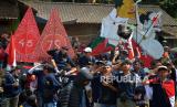 Warga membawa kuda lumping berukuran raksasa saat acara Wahyu Makutaning Kamardikan di Panggung Festival Lima Gunung Desa Baleagung, Grabag, Magelang, Jawa Tengah, Kamis (24/8/2023). Acara seni budaya memeriahkan Agustusan ini diikuti oleh 10 dusun serta sekolah di Desa Baleagung untuk menyemarakkan HUT ke-78 RI. Selain upacara menggunakan busana dan bahasa Jawa dalam acara ini juga ada karnaval kebudayaan dari setiap dusun. Berbagai ogoh-ogoh dan kostum ditampilkan oleh warga untuk menyemarakkan pentas seni dan budaya ini. (FOTO : Republika/Wihdan Hidayat)