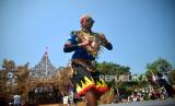 Peserta menggunakan kostum Topeng Ireng saat upacara menggunakan busana dan bahasa Jawa saat Wahyu Makutaning Kamardikan di Panggung Festival Lima Gunung Desa Baleagung, Grabag, Magelang, Jawa Tengah, Kamis (24/8/2023). Acara seni budaya memeriahkan Agustusan ini diikuti oleh 10 dusun serta sekolah di Desa Baleagung untuk menyemarakkan HUT ke-78 RI. Selain upacara menggunakan busana dan bahasa Jawa dalam acara ini juga ada karnaval kebudayaan dari setiap dusun. Berbagai ogoh-ogoh dan kostum ditampilkan oleh warga untuk menyemarakkan pentas seni dan budaya ini. (FOTO : Republika/Wihdan Hidayat)