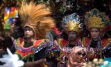 Warga mengikuti karnaval Wahyu Makutaning Kamardikan di Panggung Festival Lima Gunung Desa Baleagung, Grabag, Magelang, Jawa Tengah, Kamis (24/8/2023). Acara seni budaya memeriahkan Agustusan ini diikuti oleh 10 dusun serta sekolah di Desa Baleagung untuk menyemarakkan HUT ke-78 RI. Selain upacara menggunakan busana dan bahasa Jawa dalam acara ini juga ada karnaval kebudayaan dari setiap dusun. Berbagai ogoh-ogoh dan kostum ditampilkan oleh warga untuk menyemarakkan pentas seni dan budaya ini. (FOTO : Republika/Wihdan Hidayat)