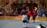 Warga mengikuti upacara menggunakan busana dan bahasa Jawa saat Wahyu Makutaning Kamardikan di Panggung Festival Lima Gunung Desa Baleagung, Grabag, Magelang, Jawa Tengah, Kamis (24/8/2023). Acara seni budaya memeriahkan Agustusan ini diikuti oleh 10 dusun serta sekolah di Desa Baleagung untuk menyemarakkan HUT ke-78 RI. Selain upacara menggunakan busana dan bahasa Jawa dalam acara ini juga ada karnaval kebudayaan dari setiap dusun. Berbagai ogoh-ogoh dan kostum ditampilkan oleh warga untuk menyemarakkan pentas seni dan budaya ini. (FOTO : Republika/Wihdan Hidayat)