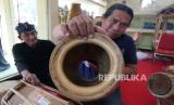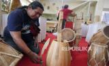 Perajin memperlihatkan cara membuat gendang berbahan bambu karya Bengkel Alat Musik Bambu (BAMB) Lembaga Pendidikan Seni Nusantara atau PSN saat pameran ekonomi kreatif pada acara Temu Karya Taman Budaya Nusantara se-Indonesia XXII Tanuh 2023, di Taman Budaya Jawa Barat, Dago, Kota Bandung, Kamis (24/8/2023). Hasil karya BAMB ini membuktikan bahwa bambu yang berlimpah di Indonesia bisa menjadi alternatif bahan dasar untuk dibuat bermacam alat musik akustika. (FOTO : Edi Yusuf/Republika)