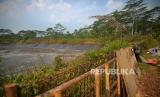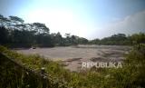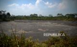 Kondisi Embung Soropadan yang mengering di Pringsurat, Temanggung, Jawa Tengah, Kamis (24/8/2023). Menurut informasi warga bahwa Embung Soropadan mengalami kebocoran dan belum ada perbaikan sejak beberapa tahun terakhir. Hal ini menyebabkan keringnya air embung saat musim kemarau. Embung dengan luas 1 hektare ini dibuat untuk mendukung pertanian warga terutama saat musim kemarau. (FOTO : Republika/Wihdan Hidayat)