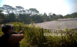Jurnalis melihat kondisi Embung Soropadan yang mengering di Pringsurat, Temanggung, Jawa Tengah, Kamis (24/8/2023). Menurut informasi warga bahwa Embung Soropadan mengalami kebocoran dan belum ada perbaikan sejak beberapa tahun terakhir. Hal ini menyebabkan keringnya air embung saat musim kemarau. Embung dengan luas 1 hektare ini dibuat untuk mendukung pertanian warga terutama saat musim kemarau. (FOTO : Republika/Wihdan Hidayat)