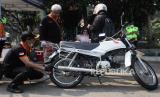 Petugas melakukan uji emisi kendaraan motor yang terjaring uji coba tilang uji emisi di Terminal Blok M, Jakarta Selatan, Jumat (25/8/2023). Pemerintah Provinsi DKI Jakarta bersama Polda Metro Jaya melakukan uji coba tilang uji emisi di lima wilayah DKI Jakarta sebelum diberlakukan sanksi tilang pada 1 September 2023. Denda sanksi tilang bagi kendaraan yang tidak lulus uji emisi sebesar Rp 250.000 bagi kendaraan motor dan Rp 500.000 bagi kendaraan mobil. (FOTO : Republika/Putra M. Akbar)