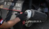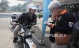 Petugas mendata kendaraan motor yang terjaring uji coba tilang uji emisi di Terminal Blok M, Jakarta Selatan, Jumat (25/8/2023). Pemerintah Provinsi DKI Jakarta bersama Polda Metro Jaya melakukan uji coba tilang uji emisi di lima wilayah DKI Jakarta sebelum diberlakukan sanksi tilang pada 1 September 2023. Denda sanksi tilang bagi kendaraan yang tidak lulus uji emisi sebesar Rp 250.000 bagi kendaraan motor dan Rp 500.000 bagi kendaraan mobil. (FOTO : Republika/Putra M. Akbar)