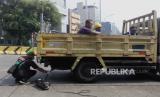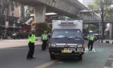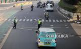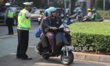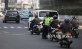 Polisi menghentikan kendaraan saat uji coba tilang uji emisi di Terminal Blok M, Jakarta Selatan, Jumat (25/8/2023). Pemerintah Provinsi DKI Jakarta bersama Polda Metro Jaya melakukan uji coba tilang uji emisi di lima wilayah DKI Jakarta sebelum diberlakukan sanksi tilang pada 1 September 2023. Denda sanksi tilang bagi kendaraan yang tidak lulus uji emisi sebesar Rp 250.000 bagi kendaraan motor dan Rp 500.000 bagi kendaraan mobil. (FOTO : Republika/Putra M. Akbar)