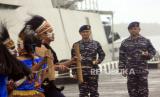 Komandan KRI Kapak-625, Letkol Laut (P) Rahmat Arif (kedua kanan) dan Komandan KRI Panah-626, Letkol Laut (P) Irianto Kurniawan (kanan) disambut tarian khas Papua di dermaga Armada III, Katapop, Kabupaten Sorong, Papua Barat Daya, Jumat (25/8/2023). TNI AL memperkuat dua armada perang yaitu KRI Kapak-625 dan KRI Panah-626 yang merupakan kapal Cepat Rudal (KCR) untuk mendukung pengamanan di wilayah Armada III Timur Indonesia. (FOTO : Antara/Olha Mulalinda )
