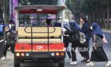 Sejumlah pengunjung menaiki mobil listrik layanan gratis di kawasan Gelora Bung Karno (GBK), Senayan, Jakarta, Jumat (25/8/2023). Pengelola GBK melakukan kebijakan bebas kendaraan bermotor yang dimulai dari pukul 05.00 hingga 22.00 WIB berlangsung pada 25 Agustus hingga 3 September mendatang guna menopang kegiatan kejuaraan dunia bola basket FIBA dan ASEAN Summit. (FOTO : ANTARA FOTO/M Risyal Hidayat)