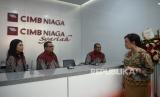 Presiden Direktur CIMB Niaga Lani Darmawan (kanan) berbincang dengan karyawan saat meresmikan pembukaan model terbaru kantor cabang masa depan CIMB Niaga yaitu Digital Branch di Pantai Indah Kapuk (PIK), Jakarta, Jumat (25/8/2023). Kantor cabang dengan konsep hybrid yang memadukan antara Cabang Konvensional dan Digital Lounge ini menawarkan pengalaman perbankan yang lengkap dan serba digital dengan tetap mempertahankan sentuhan layanan personal yang ramah khas CIMB Niaga untuk nasabah #YangUtama. (FOTO : Republika/Prayogi)