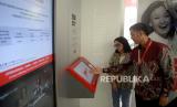 Nasabah mencoba layanan self service banking di kantor cabang masa depan CIMB Niaga yaitu Digital Branch di Pantai Indah Kapuk (PIK), Jakarta, Jumat (25/8/2023). Kantor cabang dengan konsep hybrid yang memadukan antara Cabang Konvensional dan Digital Lounge ini menawarkan pengalaman perbankan yang lengkap dan serba digital dengan tetap mempertahankan sentuhan layanan personal yang ramah khas CIMB Niaga untuk nasabah #YangUtama. (FOTO : Republika/Prayogi)