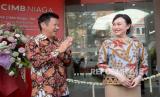 Presiden Direktur CIMB Niaga Lani Darmawan (kanan) berbincang dengan Chief of Network & Digital Banking CIMB Niaga Budiman Tanjung (kiri) saat meresmikan pembukaan model terbaru kantor cabang masa depan CIMB Niaga yaitu Digital Branch di Pantai Indah Kapuk (PIK), Jakarta, Jumat (25/8/2023). Kantor cabang dengan konsep hybrid yang memadukan antara Cabang Konvensional dan Digital Lounge ini menawarkan pengalaman perbankan yang lengkap dan serba digital dengan tetap mempertahankan sentuhan layanan personal yang ramah khas CIMB Niaga untuk nasabah #YangUtama. (FOTO : Republika/Prayogi)