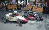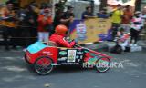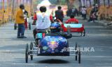 Peserta berlomba beradu kecepatan menuju garis finish pada Lomba Kereta Peti Sabun Ke-10 Tahun 2023 (LKPS X 2023), di halaman Gedung Geologi, Kota Bandung, Sabtu (26/8/2023). (FOTO : Edi Yusuf/Republika)