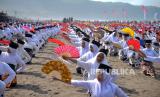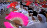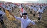 Ribuan pelajar membawakan Tari Montro atau Kesenian Shalawat Montro di Pantai Parangtritis, Bantul, Yogyakarta, Sabtu (26/8/2023). (FOTO : Republika/Wihdan Hidayat)