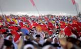 Sekitar 10 ribu pelajar SMA sederajat menari Montro secara bersama untuk memecah rekor MURI penari terbanyak ketegori Tari Montro. (FOTO : Republika/Wihdan Hidayat)