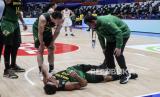 Point Guard Brazil Raul Neto Togni (tengah) cedera pada laga Piala Dunia Basket FIBA 2023 di Jakarta, Rabu Sabtu (26/8/2023). (FOTO : EPA-EFE/BAGUS INDAHONO)