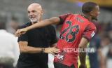Manajer AC Milan Stefano Pioli bersama Malick Thiawat merayakan kemenangan usai berakhirnya pertandingan sepak bola Serie A antara AC Milan dan Torino di stadion San Siro di Milan, Italia, Ahad, (27/8/2023)dinihari WIB. (FOTO : AP Photo/Luca Bruno)