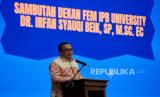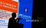 Dekan FEM IPB University Irfan Syauqi Beik menyampaikan sambutan dalam acara seminar nasional di Auditorium Fakultas Ekonomi dan Manajemen IPB University, Bogor, Jawa Barat, Sabtu (26/8/2023). Seminar tersebut mengangkat tema Menghadapi Ketidakpastian Global Melalui Optimalisasi Pembangunan Ekonomi Syariah Berkelanjutan yang diikuti oleh tamu undangan dan mahasiswa Fakultas Ekonomi dan Manajemen IPB University. (FOTO : Republika/Thoudy Badai)