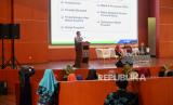 Wakil Kepala Badan Pengembangan Bisnis, Investasi dan Wakaf IPB University Alla Asmara memaparkan materi dalam acara seminar nasional di Auditorium Fakultas Ekonomi dan Manajemen IPB University, Bogor, Jawa Barat, Sabtu (26/8/2023). Seminar tersebut mengangkat tema Menghadapi Ketidakpastian Global Melalui Optimalisasi Pembangunan Ekonomi Syariah Berkelanjutan yang diikuti oleh tamu undangan dan mahasiswa Fakultas Ekonomi dan Manajemen IPB University. (FOTO : Republika/Thoudy Badai)