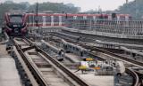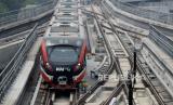 Kereta LRT Jabodebek melintas di jalur LRT Cawang - Dukuh Atas, Jakarta, Ahad (27/8/2023). LRT Jabodebek dijadwalkan beroperasi melayani penumpang mulai Senin (28/8/2023) di 18 stasiun yang ditetapkan. Sebanyak 18 stasiun yang melayani pelanggan LRT Jabodebek, yaitu Stasiun Dukuh Atas, Setiabudi, Rasuna Said, Kuningan, Pancoran, Cikoko, Ciliwung, Cawang, TMII, Kampung Rambutan, Ciracas, Harjamukti, Halim, Jatibening Baru, Cikunir I, Cikunir II, Bekasi Barat dan Jatimulya. Presiden Jokowi rencananya akan meresmikan LRT Jabodebek tersebut. (FOTO : Republika/Prayogi)