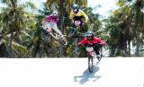 Pebalap sepeda Jawa Timur Muhamad Firmandika beradu cepat pada kejuaraan nasional (kejurnas) BMX kategori Boys 13-14 di Sirkuit BMX Muncar, Banyuwangi, Jawa Timur, Ahad (27/8/2023). Kejurnas BMX yang mempertandingkan 13 kategori yang diikuti sembilan provinsi tersebut digelar sebagai Babak Kualifikasi Pekan Olahraga Nasional (BK PON). (FOTO : ANTARA FOTO/Budi Candra Setya)