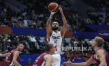 Guard Prancis Evan Fournier (10) melakukan shooting saat melawan Latvia pada pertandingan grup H Piala Dunia Bola Basket antara Prancis dan Latvia di Stadion Indonesia Arena di Jakarta, Indonesia, Ahad (27/8/2023). (FOTO : AP Photo/Achmad Ibrahim)