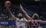 Pebasket Prancis Evan Fournier (kanan) melakukan lay up melewati adangan pebasket Latvia pada pertandingan penyisihan grup Piala Dunia Bola Basket FIBA 2023 antara Prancis dan Latvia di Jakarta, Indonesia, Ahad (27/2023). (FOTO : EPA-EFE/ADI WEDA)