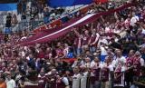 Suporter mengibarkan bendera besar Latvia sebelum dimulainya pertandingan grup H Piala Dunia Bola Basket antara Prancis dan Latvia di Stadion Indonesia Arena di Jakarta, Indonesia, Ahad (27/8/2023). (FOTO : AP Photo/Achmad Ibrahim)