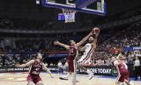 Guard Prancis Evan Fournier (10) melakukan lay up saat melawan Latvia pada pertandingan grup H Piala Dunia Bola Basket antara Prancis dan Latvia di Stadion Indonesia Arena di Jakarta, Indonesia, Ahad (27/8/2023). (FOTO : AP Photo/Achmad Ibrahim)