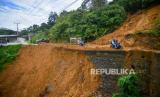 REPUBLIKA.CO.ID, PADANG. -- Pengendara motor melewati jalan yang longsor di Jalan Lingkar Nipah - Teluk Bayur, di Bukit Gado-gado Padang, Sumatera Barat, Senin (28/8/2023). Jalan alternatif ke Teluk Bayur sekaligus akses wisata tersebut longsor akibat curah hujan tinggi selama dua hari terakhir dan untuk sementara masih bisa dilewati bergantian namun kondisinya membahayakan pengendara karena banyak material bebatuan di atas bukit.
