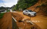 Mobil melewati jalan yang longsor di Jalan Lingkar Nipah - Teluk Bayur, di Bukit Gado-gado Padang, Sumatera Barat, Senin (28/8/2023). Jalan alternatif ke Teluk Bayur sekaligus akses wisata tersebut longsor akibat curah hujan tinggi selama dua hari terakhir dan untuk sementara masih bisa dilewati bergantian namun kondisinya membahayakan pengendara karena banyak material bebatuan di atas bukit. (FOTO : ANTARA FOTO/Iggoy el Fitra )