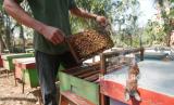 Anggota kelompok peternak Sumber Nektar menunjukkan produksi madunya di Ungaran, Kabupaten Semarang, Jawa Tengah, Selasa (29/8/2023). Kelompok peternak lebah UMKM binaan BUMN PT Jaminan Kredit Indonesia (Jamkrindo) tersebut memanfaatkan program pemberdayaan Jamkrindo melalui Pendanaan Usaha Mikro dan Kecil (PUMK) untuk mengembangkan skala bisnis. Para peternak mampu menghasilkan dua kilogram madu dalam tiga sampai empat kali panen dari total 90 kotak lebah serta memiliki omzet penjualan sekitar Rp70 juta dalam dua bulan tergantung musim panennya. (FOTO : Dok Republika)