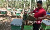 Anggota kelompok peternak Sumber Nektar merawat budi daya sarang lebah madu jenis mellifera di Ungaran, Kabupaten Semarang, Jawa Tengah, Selasa (29/8/2023). Kelompok peternak lebah UMKM binaan BUMN PT Jaminan Kredit Indonesia (Jamkrindo) tersebut memanfaatkan program pemberdayaan Jamkrindo melalui Pendanaan Usaha Mikro dan Kecil (PUMK) untuk mengembangkan skala bisnis. Para peternak mampu menghasilkan dua kilogram madu dalam tiga sampai empat kali panen dari total 90 kotak lebah serta memiliki omzet penjualan sekitar Rp70 juta dalam dua bulan tergantung musim panennya. (FOTO : Dok Republika)