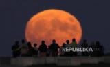 Supermoon muncul di atas Danau Michigan saat penonton menyaksikan dari pantai 31st Street di Chicago pada Rabu, (30/8/2023). (FOTO : AP Photo/Charles Rex Arbogast)