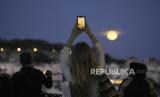 Seorang wanita memotret supermoon yang terbit di atas Lisbon, Rabu, (30/8/2023). (FOTO : AP Photo/Armando Franca)