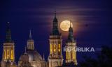 Bulan Biru purnama terbit di atas Basilika El Pilar di Zaragoza, Spanyol, (30/8/2023). (FOTO : EPA-EFE/JAVIER BELVER)