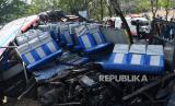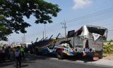 Sejumlah orang mengamati kondisi bus yang rusak akibat bertabrakan di Geneng, Ngawi, Jawa Timur, Kamis (31/8/2023). Bus Eka jurusan Yogyakarta-Surabaya bertabrakan dengan bus Sugeng Rahayu jurusan Surabaya-Yogyakarta saat kedua sopir menghindari penyeberang jalan yang mengakibatkan empat orang tewas terdiri dua orang sopir, seorang kernet dan seorang pejalan kaki serta 14 penumpang dari kedua bus mengalami luka. (FOTO : ANTARA FOTO/Siswowidodo)