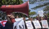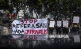 Sejumlah jurnalis bersama pers mahasiswa dan aktivis melakukan aksi bersama di Taman Vanda, Jalan Merdeka, Kota Bandung, Kamis (31/8/2023). Dalam aksi yang digelar oleh PFI Bandung, AJI Bandung, FDWB dan WFB tersebut mereka mengecam tindakan kekerasan oleh oknum aparat kepolisian terhadap dua jurnalis yang sedang meliput peristiwa kericuhan Dago Elos. Selain itu, mereka mendesak kepolisian dan institusi negara lain untuk menghormati profesi jurnalis, serta menuntut penjaminan kebebasan berekspresi bagi warga sipil. (FOTO : ABDAN SYAKURA/REPUBLIKA)