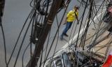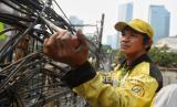 Petugas Bina Marga DKI Jakarta melakukan penataan kabel udara di Jalan Guru Mughni, Setiabudi, Jakarta Selatan, Kamis (31/8/2023). Pemutusan kabel tersebut dilakukan sepanjang 600 meter dengan jumlah 84 kabel dari 17 operator sebagai upaya mempercantik kawasan tersebut dengan memindahkan jaringan kabel udara ke bawah tanah. (FOTO : Republika/Thoudy Badai)