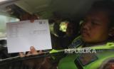 Polisi memperlihatkan surat keterangan lulus uji emisi di Subdit Gakkum Ditlantas Polda Metro Jaya, Jakarta, Jumat (1/9/2023). Direktorat Lalu Lintas Polda Metro Jaya bersama Dinas Lingkungan Hidup DKI Jakarta mulai memberlakukan tilang uji emisi terhadap kendaraan roda dua dan roda empat sebagai upaya agar masyarakat ikut berkontribusi untuk mengatasi permasalahan buruknya kualitas udara di Ibu Kota. Denda sanksi tilang bagi kendaraan yang tidak lulus uji emisi sebesar Rp 250.000 bagi kendaraan motor dan Rp 500.000 bagi kendaraan mobil. (FOTO : Republika/Putra M. Akbar)