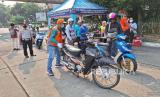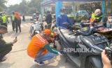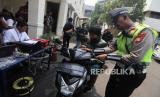 Polisi memberikan pengarahan kepada pengendara motor yang akan melakukan uji emisi di Subdit Gakkum Ditlantas Polda Metro Jaya, Jakarta, Jumat (1/9/2023). Direktorat Lalu Lintas Polda Metro Jaya bersama Dinas Lingkungan Hidup DKI Jakarta mulai memberlakukan tilang uji emisi terhadap kendaraan roda dua dan roda empat sebagai upaya agar masyarakat ikut berkontribusi untuk mengatasi permasalahan buruknya kualitas udara di Ibu Kota. Denda sanksi tilang bagi kendaraan yang tidak lulus uji emisi sebesar Rp 250.000 bagi kendaraan motor dan Rp 500.000 bagi kendaraan mobil. (FOTO : Republika/Putra M. Akbar)
